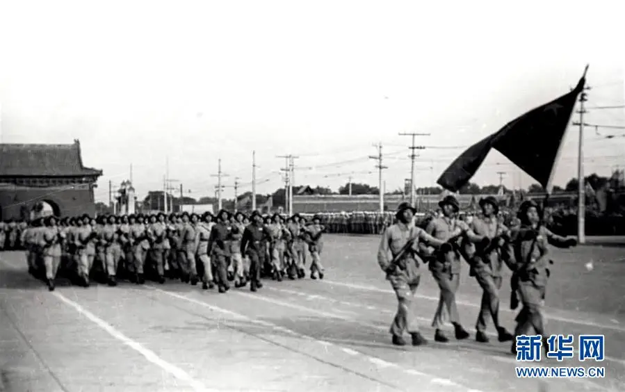1949年10月1日,人们在北京天安门广场参加开国大典。新华社发升旗结束后,毛泽东宣读了中央人民政府公告。接着举行阅兵式。人民解放军陆海空三军受阅部队以连为单位列成方阵,迈着威武雄壮的步伐由东向西行进,分列通过天安门前。刚刚组建的人民空军的14架战斗机、轰炸机和教练机,在天安门广场凌空掠过。阅兵式持续近3个小时,结束时天色已晚,长安街上华灯齐放,工人、农民、学生、市民的游行队伍高举红旗,纵情欢呼人民当家作主的新中国诞生。